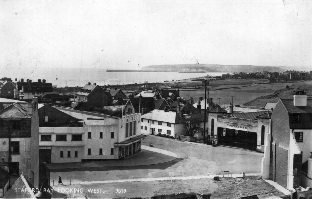 Seaford was always an important staging post between Brighton and Eastbourne. The predecessor to Southdown, Worthing Motor Services started a stage carriage service between the Royal Mews Brighton and Eastbourne, via Seaford in May 1915 and they opened a booking office on the Esplanade Seaford. This was replaced in 1923 by an office at 5 Clinton Place. The first bus garage in Seaford was located in Richmond Road, but as traffic increased it was replaced by a purpose-built garage in Dane Road. Below is a photograph, courtesy of Seaford Museum, showing the garage, the site of which is now the Seaford health centre. The photograph also shows the “Ritz” cinema opposite which was demolished and is now the site of Morrisons supermarket. A larger more modern bus garage was then built in 1957 in Claremont Road as a replacement. This was later found to be in excess of requirements and was leased to an antique shop as a store, Southdown buses then using the concrete apron in front of the building for open-air stabling.