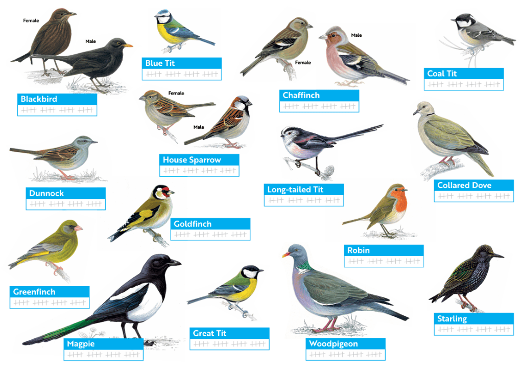 The RSPB have created a handy guide on how to take part and submit your sightings which can be found here. You will also be able to download a useful guide which includes the picture below to help you identify any birds you see..